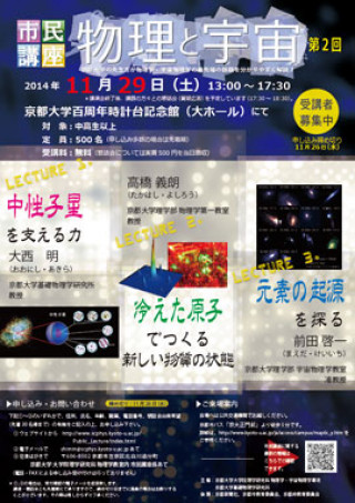 本講座は21世紀COEプログラム「物理学の多様性と普遍性の探究拠点」(2003-2007年度)とグローバルCOEプログラム「普遍性と創発性から紡ぐ次世代物理学」(2008-2012年度)の主催で10回にわたり開催してきた市民講座の後を引き継ぐものです。