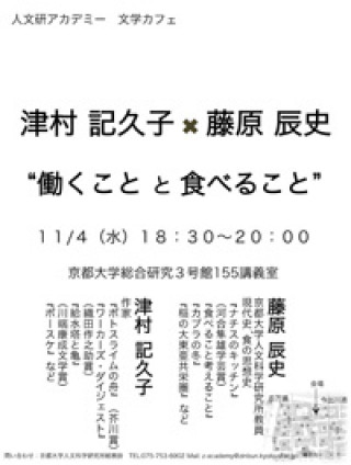 働くことをテーマに作品を書き続ける芥川賞作家の津村記久子さんと、食べることをテーマに研究をする藤原辰史 人文科学研究所准教授の対談です。就活・仕事・女性・台所・カフェ・食べものなどをめぐって、津村さんの作品を手がかりにしながら、フリー・トークを行います。