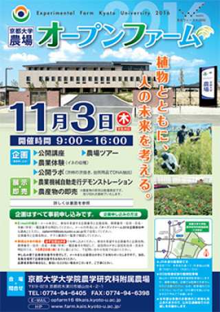 「作物生産のサイエンス」を基本テーマとして、公開講座、農場ツアー、農業体験実習、公開ラボ、パネル・器具展示、農場農産物の即売などを行います。イベント満載の一日です。新農場がオープンし、木津川市での最初の開催となります。