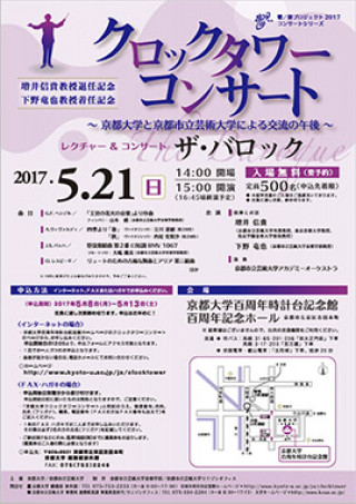 京都大学と京都市立芸術大学は、「京都大学と京都市立芸術大学との大学間交流に関する覚書」による事業として、2017年度も「クロックタワーコンサート~京都大学と京都市立芸術大学による交流の午後~レクチャー&コンサート ザ・バロック」を開催します。