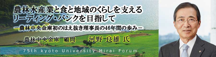 第75回京都大学未来フォーラムは、農学部卒業生で、農林中央金庫顧問の河野 良雄氏を講師にお迎えし開催します。