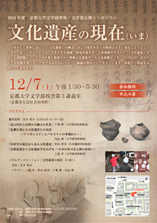 本シンポジウムでは、さまざまな地域・研究対象をめぐる事例報告をもとに、「文化遺産」をめぐる諸問題について、本年度に新設された文学研究科附属文化遺産学・人文知連携センター(CESCHI)がどのような役割を果たすことができるのかについて、議論を深めたいと考えています。多数のご参加をお待ちしています。