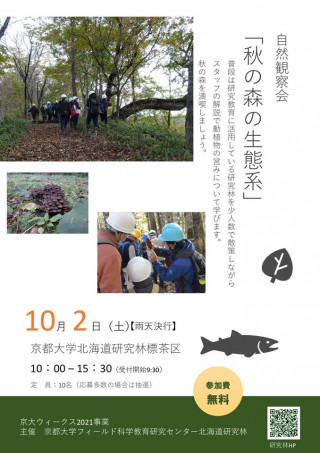 自然観察会では、普段は研究教育に活用している森林を研究林スタッフの解説により少人数で散策しながら、動植物の生態について学びます。実りの秋を迎えた森を五感を使って満喫してください。