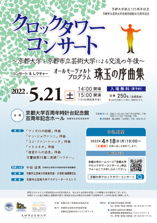 京都大学と京都市立芸術大学は、「京都大学と京都市立芸術大学との大学間交流に関する覚書」による事業として、2022年度も「クロックタワーコンサート~京都大学と京都市立芸術大学による交流の午後~コンサート&レクチャー オールモーツァルトプログラム 珠玉の序曲集」を開催します。