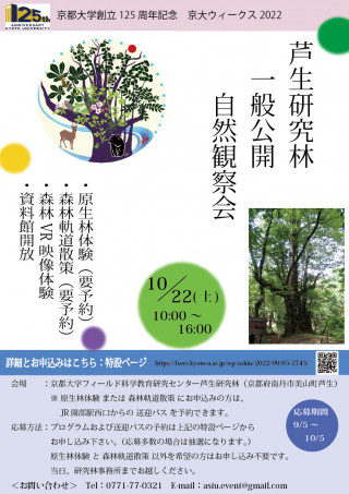 100周年を迎えた芦生研究林は南丹市美山町に4,000ha余りの広大な森林を有し、一部には原生的な森林も残っています。京都大学吉田キャンパスから車で2時間と比較的近く、学生実習や研究活動に利用されています。大都市近郊に原生的な森林が残されている所は非常に珍しく、人文科学、芸術学など分野を超えたさらなる教育・研究利用の推進に努めています。