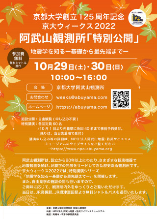 7月29日(金曜日)から11月6日(日曜日)を「京大ウィークス2022」とし、この期間に、全国各地の京都大学の教育研究施設が公開イベントを実施します。詳細・その他のイベントについては、以下のページをご確認ください。