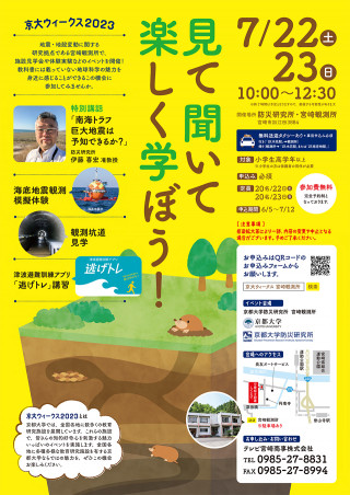 地震・地殻変動に関する研究拠点である宮崎観測所で、ミニ講座と施設見学会を行います。教科書には載っていない地球科学の魅力を身近に感じることができるこの機会に参加してみませんか。普段は入れない観測坑道を見学したり、海底地震計などの観測機器に触れることができます。