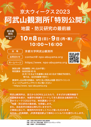 特別講演「地震・防災研究の最前線」を開催します。防災研究所で取り組まれている地震・防災研究の最新の成果についてご紹介する4つの講演を実施します。施設公開は、観測所内外を自由に観覧する方式ですので、ご興味に応じてゆっくりとご覧ください。