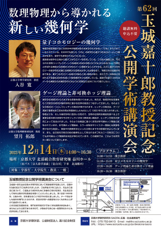 玉城嘉十郎先生は京都大学理学部において理論物理学を講じられ、在職中53歳の若さでご他界されましたが、ご他界後30年に当たり、先生のご意志に基づいて、ご遺族より奨学のために多額のご寄附をいただき、先生を記念して毎年公開の学術講演会を開催しています。第1回は1969年秋、以後54年、回を重ねること今回で62回に達しました。テーマは必ずしも既存の専門にとらわれず、明日の学問への展望をひらくものをと心がけて選ばれています。