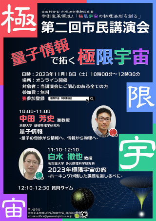 「量子情報 -量子の奇妙から情報へ、情報から物理へ-」、「2023年極限宇宙の旅 -ホーキングが残した課題を道しるべに-」と題した2つの講演を行います。