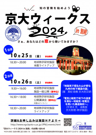 6月7日(金曜日)から11月9日(土曜日)を「京大ウィークス2024」とし、この期間に、全国各地の京都大学の教育研究施設が公開イベントを実施します。詳細・その他のイベントについては、以下のページをご確認ください。