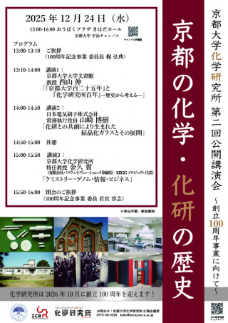 この節目を記念し、昨年の第一回に続き、第二回公開講演会「京都の化学・化研の歴史 〜化学研究所創立100周年記念事業に向けて〜」を開催します。