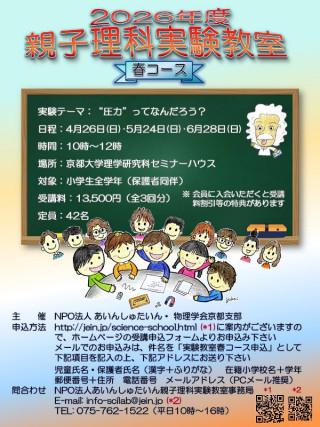 NPO法人「知的人材ネットワークあいんしゅたいん」と物理学会京都支部による親子理科実験教室(春コース)を本学で開催します。