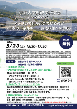 京都大学財政学研究会は、本学経済学研究科を拠点とする学術団体です。財政・公共政策分野の発展と研究者の能力向上を目的に、学術誌の発刊、地域調査、研究合宿、シンポジウム開催等を行っていま す。