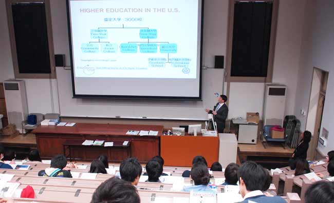 大阪・神戸米国総領事館からベンジャミン・アボット 副領事と高取朋子 査証課ビザ・アウトリーチコーディネーターにお越しいただき、副領事には米国留学に関する総合的なお話を、高取氏には米国留学のためのビザ取得手続についての説明をいただきました。