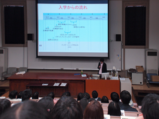 長山浩章 国際交流センター教授から、本学の制度を活用した留学の利点、通常の学業や就職活動と留学の関係等の説明や入学直後から前向きに留学を検討するよう勧めるお話があり、続いて、本学学生による交換留学支援団体ESSK代表者2名による活動の紹介、実際の留学に基づく体験談の披露がありました。