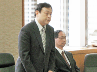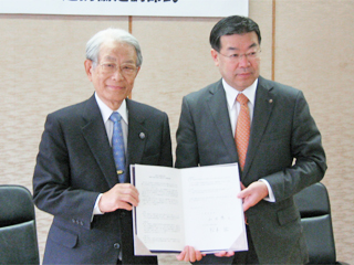これまでの経過を説明する中川教授(手前)と伊藤紳三郎 工学研究科長(奥) | 協定書署名後の松本総長(左)と山田知事(右) |