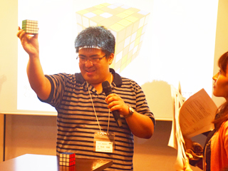 交流会では、クイズ大会や今春卒業したばかりの参加者による近況報告に加えて、コンピュータを用いたプロフェッサーキューブの解探索など本学の卒業生らしいユニークな技の披露があり、会場は大きな歓声と熱気に包まれました。関東地方はあいにくの大雨でしたが、当日のキャンセルは1人もなく、飛び込みで3人が参加し、会場は大盛況となりました。