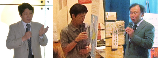 左から、内覧会で挨拶する伏木教授、解説する山崎准教授、説明する奥井代表取締役 | |