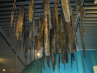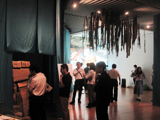開催に先立ち行われた内覧会には、学内外約50名の出席がありました。大野照文 総合博物館長および伏木亨 農学研究科教授両名の挨拶の後、本展覧会企画実行委員の 山崎英恵 龍谷大学法学部准教授の展示解説、奥井隆 奥井海生堂代表取締役からは昆布についておよび中村元計 日本料理ラボラトリー研究会実行委員長からは研究会の活動について説明があり、出席者は、吊り下げ昆布と蔵囲い昆布にびっくりし、カツオ節が発酵食品であることに興味を持ち、熱心に展示を鑑賞しました。