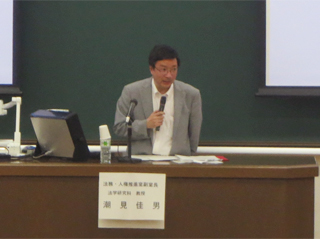 制度の説明をする潮見副室長 | 心構えなどを語る中川講師と話を聞く参加者 |
