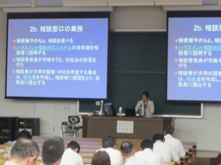 林信夫 法務・人権推進室長の開会挨拶の後、潮見佳男 法務・人権推進室副室長・法学研究科教授が本学のハラスメント対応制度について、中川純子 学生総合支援センター講師がハラスメント相談の心構えについて講演を行いました。