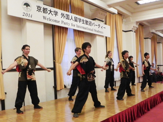 また、恒例の歓迎イベントでは、本学ダンスチーム「彩京前線」による「京炎! そでふれ」の演舞がありました。学生ダンサーたちは現代風にアレンジされた着物の衣装を身につけ、迫力ある踊りを披露し、会場は一気に沸き立ちました。