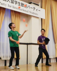続いて、ジャグリングサークルの「ジャグリング・ドーナツ」による演技が披露され、巧みな技とコミカルな動きで留学生を惹きつけました。
