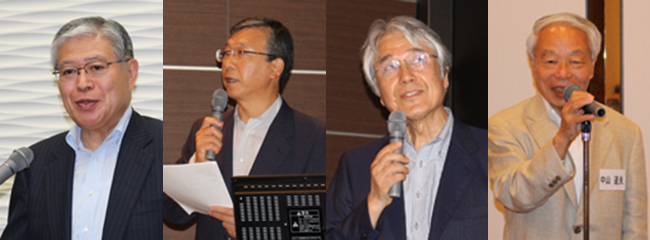 左から講演を行う横内会長、開会の挨拶を行う澤田事務局長、講演を行う赤松理事・副学長および挨拶を行う中山副会長 | |