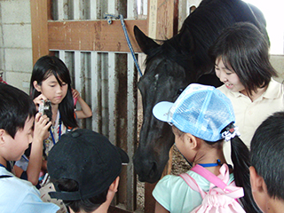 厩舎で馬と触れ合う
