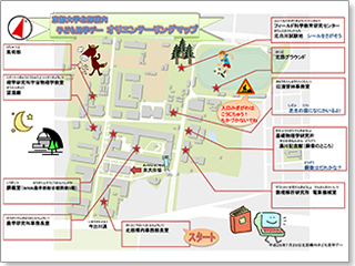 オリエンテーリングのチェックポイントは10か所セットされており、(1)理学研究科宇宙物理学教室望遠鏡(理学部4号館屋上)、(2)学生体育会馬術部厩舎、(3)北部グラウンド、(4)講義室(農学部総合館5階)、(5)基礎物理学研究所湯川博士胸像、(6)数理解析研究所電算機械室(地下)、(7)フィールド科学教育研究センター北白川試験地、(8)旧演習林事務室、(9)北部構内事務部長室、(10)農学研究科事務長室です。