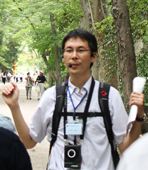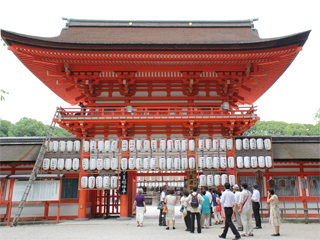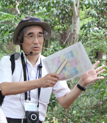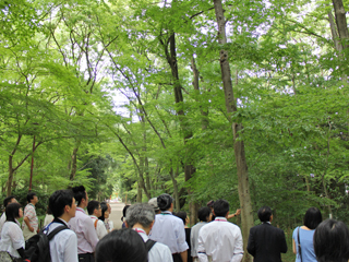 下鴨神社においては、森本幸裕 名誉教授と今西純一 地球環境学堂助教による案内で史跡、糺の森を散策しました。鎮守の森で、多様な植物に触れた参加者は、「街中なのにこれほどの巨木がたくさんあってビックリした」、「夏でも涼を感じられる」と、自然の豊かさを満喫した様子でした。
