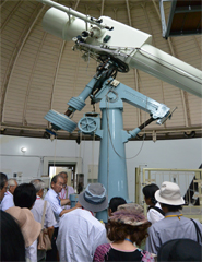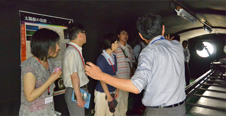 理学研究科附属花山天文台では柴田一成 同天文台長による案内と解説が行われ、参加者の方々は、歴史を感じさせる天体望遠鏡などに興味深そうに見入っていました。中でも3Dメガネをかけて立体的な宇宙を見ることができる「4次元デジタル宇宙シアター」は、多くの関心を集めました。