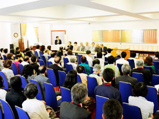報告会は、高見茂 理事補の司会のもと、松本紘 総長が寄付者の方々への謝意を表し、京都大学の沿革から、若手人材海外派遣事業「ジョン万プログラム」、グローバルリーダーを育成するための新しいタイプの大学院「総合生存学館(思修館)」など、最近の取り組みまでを紹介し、それらの取り組みを支える京都大学基金の必要性について述べました。続いて、小寺秀俊 理事・副学長から京大サロンに設置された「京都大学基金寄付者銘板」の紹介と、京都大学基金の構成についての説明があり、基金に対するさらなる支援が呼びかけられました。
