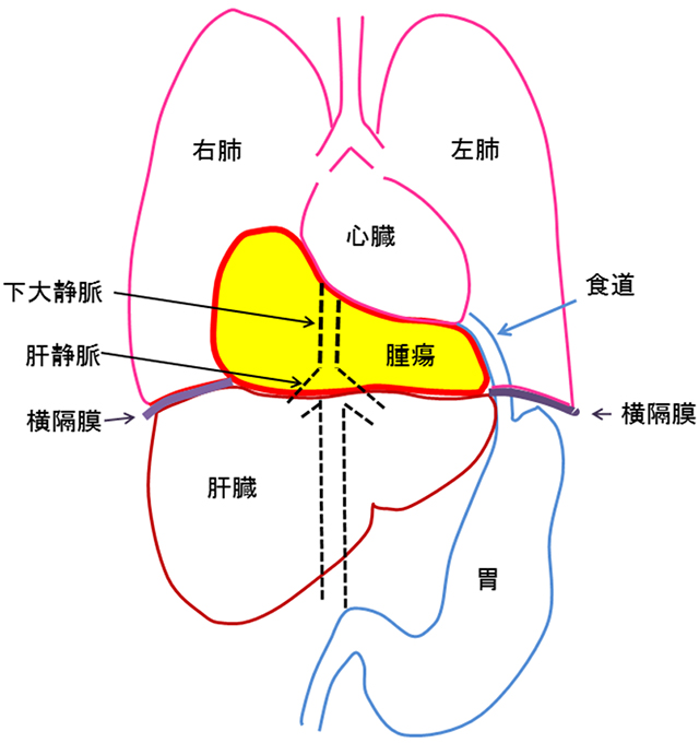 患者は、60歳代女性で、他の病院で摘出不可能と判断された巨大な胸部肉腫の相談に医学部附属病院呼吸器外科に来られました。腫瘍は、両肺・心臓・食道・肝臓に取り囲まれた位置にあり、下大静脈を取り囲み、肝静脈の近くに及んでいました。そこで、呼吸器外科、心臓血管外科、肝胆膵移植外科、消化管外科、麻酔科がチームを作って、摘出方法について検討しました。