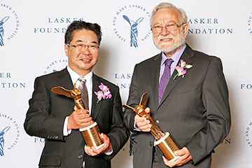ラスカー基礎医学賞のトロフィーを授与された森教授(左)とウォルター教授(右)