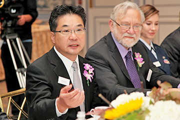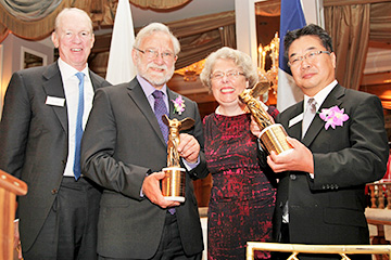 左から、ウィラード・オーバーロック ラスカー財団理事長、ウォルター教授、クレア・ポメロイ 同財団会長、森教授