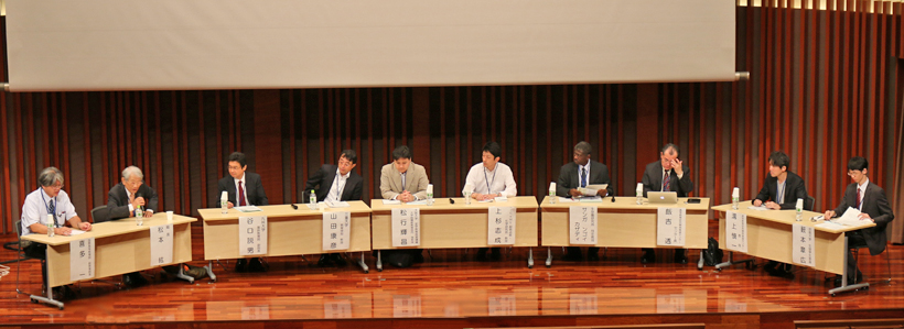 午後の部は、飯吉透 高等教育研究開発推進センター長が、「主体的な学びをどう育むか -教育文化・方法・環境・制度の観点から-」というテーマで講演を行いました。講演に引き続き、「京都大学における主体的な学びとは」というタイトルでパネルディスカッションを行いました。コーディネーターは喜多一 国際高等教育院副教育院長が務め、学内からパネリストとして、松本紘 総長、上杉志成 物質-細胞統合システム拠点(iCeMS)副拠点長・化学研究所教授、SANGA - NGOIE Kazadi 生存圏研究所特定教授、飯吉センター長、溝上慎一 高等教育研究開発推進センター教授、薮本章広 生協学生委員、学外からは午前中に報告していただいた先生方に加わっていただき、多角的視点での議論を行い、「大学教育における主体的な学び」への展望を示しました。