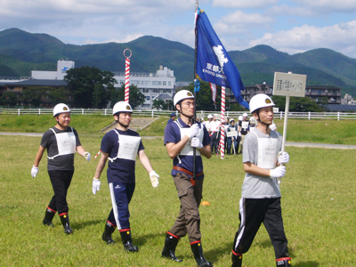 午後1時30分より嵐山東公園運動場で行われた西京自衛消防隊訓練大会に、桂キャンパス自衛消防隊が参加しました。