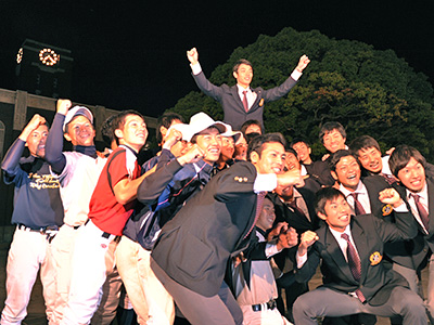 ターゲット 卒業生の方 在学生の方 一般・地域の方 公開日 2014年10月23日 硬式野球部(投手)の田中英祐さん(平成23年度入学・工学部工業化学科)がプロ野球の新人選手選択会議(ドラフト会議)で指名されました。 選手契約が締結されれば、本学硬式野球部初のプロ野球選手になります。 山極壽一総長のコメント 投球の様子 記者会見の様子 百周年時計台記念館前で記念撮影に応じる硬式野球部員 正門前での記念撮影