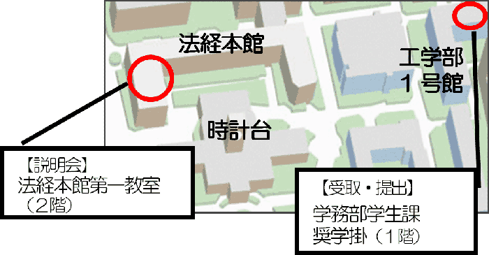 | 場所 | 吉田キャンパス本部構内 工学部 1号館1階 学務部 学生課奨学掛 |