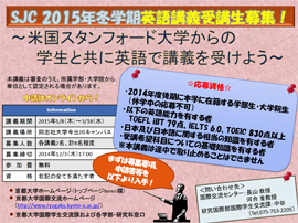 スタンフォード日本センターStanford Japan Center(SJC)が提供する英語講義の受講を希望する京都大学生を募集します。文系理系を問わず応募可能です。募集は京都大学国際交流センターを窓口として行われます。