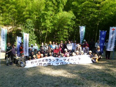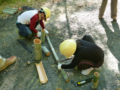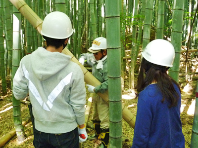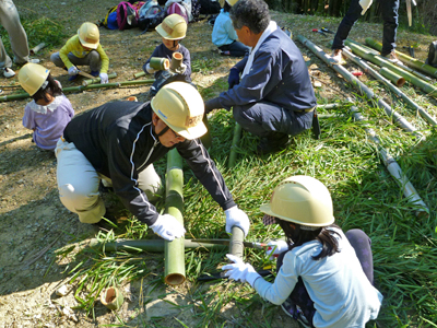 当日はスタッフを含めて80名余りが参加し、秋の爽やかな陽気の中、午前中は竹林の間伐作業に汗を流しました。午後からは伐り出した竹を使って竹細工に取り組み、参加者はプランターやフラワースタンド、鉛筆立など、竹の特徴を生かすよう思い思いに工夫を凝らした竹細工を楽しむとともに、竹との親しみ方や豊かな恵みをもたらす竹林を整備することの重要性について理解を深めることができました。