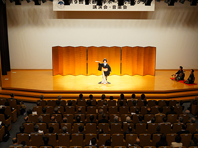 続いて、京舞 井上流により同窓生の長寿繁栄を願った「老松」の披露に次いで、菊乃井 主人の村田吉弘氏の「和食と日本料理、日本料理と京料理、それぞれ一体何が違うのか」、伏木亨 農学研究科教授の「和食のだし;おいしさの科学と次世代への継承の重要性」と題した講演がありました。村田氏の食にまつわる豊かな知識と経験に基づいた話、そして伏木教授の日本のだしの美味しさなどを学術的に捉えた話は大変興味深いもので、参加者は魅了され、熱心に聞き入っていました。