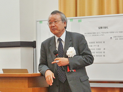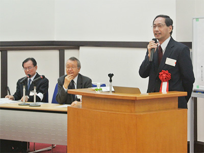 伊藤紳三郎 副会長(工学研究科長、工学部・1973年卒)の開会挨拶では、京都大学技術士会の設立から1年半の活動とともに大西有三 会長(名誉教授、元理事・副学長、工学部・1968年卒)が掲げる会員目標1000名の紹介がありました。