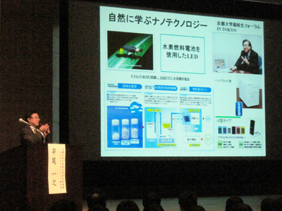 平尾一之 工学研究科教授・ナノテクノロジーハブ拠点長による「自然に学ぶナノテクノロジー -蛍の光を模倣した水素燃料電池によるLED発光-」と題した講演では、エコや地球環境に配慮したさまざまな取り組みを紹介し、将来の科学技術の躍進には若い力と知恵が必要とのメッセージが伝えられ、数々の興味深い話に会場を埋め尽くす高校生は熱心に聞き入っていました。
