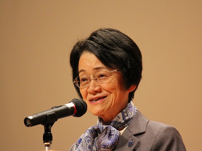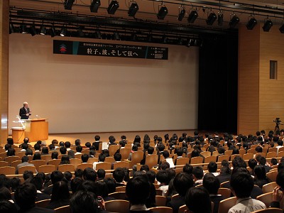 フォーラムでは、稲盛専務理事による開会の挨拶の後、ウィッテン博士より「粒子、波、そして弦へ」と題した講演が行われ、出席した京都府内の高校生約400名が熱心に聞き入っていました。