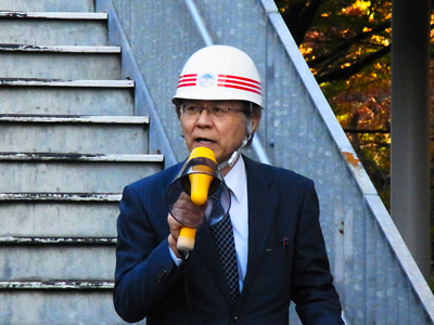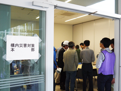 これは本学危機管理計画(地震編)に対応する訓練に、地震時の安否確認・情報伝達の要素を加え、負傷者や火災の発生等、現実的な想定のもと、組織的な避難誘導・情報伝達を総合的にシミュレーションする訓練です。教職員で組織する自衛消防地区隊を中心に、その他の教職員、学生などキャンパス全体で総勢1000名以上が参加し、初期消火や安否情報伝達、避難誘導、負傷者の救護、また避難状況の集計等、さまざまな場面が設定され、参加者は、各自の役割を確認しながら実践しました。