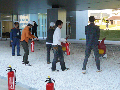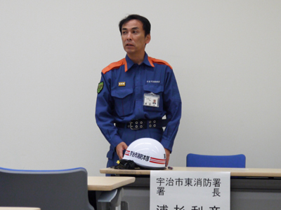 避難完了後は、宇治市東消防署の指導による消火器操作訓練も行い、参加者は熱心に説明を聞き、実際に消火器を手に取って体験しました。