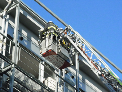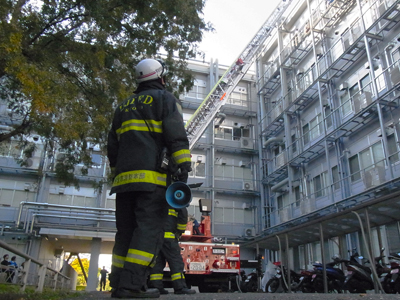 また、2014年度の防災訓練では宇治市東消防署によるはしご車を使用した残留者(教員)救助活動も行われ、実践さながらの緊張感のなか貴重な体験を得ました。